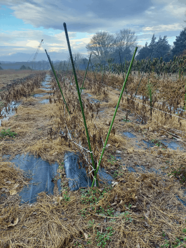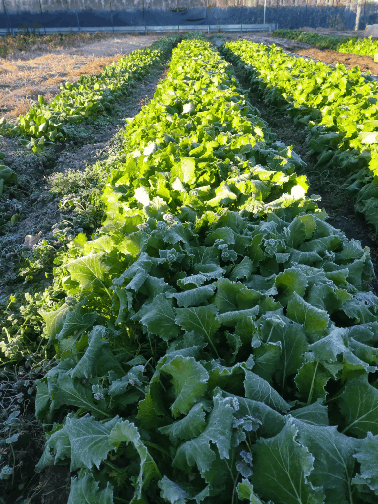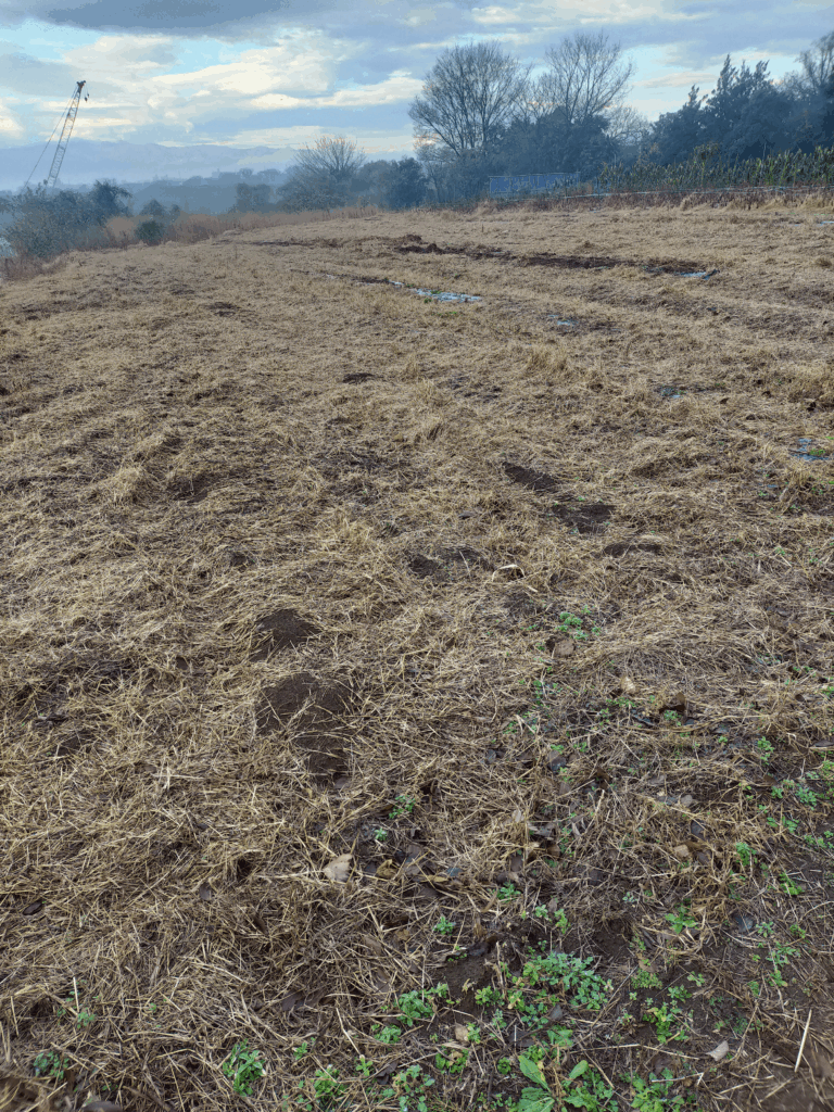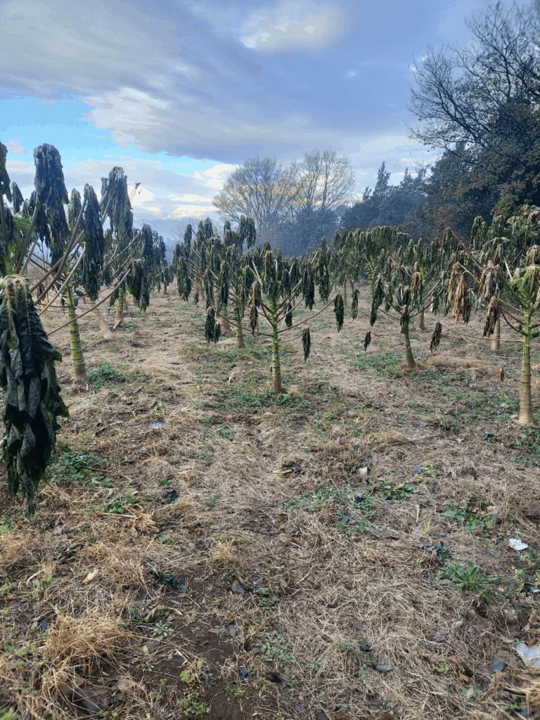 投稿日: 2025-12-242025-12-24 投稿者: oshima2025年12月、畑の景色 冬です もうすぐ今年も終わりですね。夏野菜をやっていた畝は片付けようと思いつつもいつも後回しにされ、とうとう放置されたまま年を越してしまいそうです。もうここはサトイモやるまで手を付けないでおこうかと考えています。そういった場所があちらこちらにあって少しづつ片付けている状況です。枯れた雑草刈り取り→マルチ剥がし→雑草焼却の繰り返しで今月、来月掛けてやります。 辺り一面を埋め尽くす枯れた雑草。枯れていても根はがっしり張っています。 今年の青パパイヤは大失敗に終わりました。前年まで殆ど無管理でそれなりに収穫できていたので油断していました。木は大きくなるも開花がいつもより遅くそれに引きずられ実の生長も遅れ大きくなる前に冬が来て枯れてしまったというのが今年の流れです。収穫高は想定していた量の1/10にも満たなく経営的にも大ダメージを受けました。 凍る野菜 今畑で収穫しているのは、ダイコン、カブ、白菜です。毎日ダイコンとカブを洗って出荷しています。 キャベツやカブは毎朝真っ白に凍ってます。 耕します この時期、この寒さでは種をまいても発芽はしないのが普通なので何もできないと思うのが普通なのですが、ビニールトンネルをかけて暖をとり芽を出させるという方法があるのです。とても面倒なのですが、3月頃の収穫がなにもなくなるのも厳しいのでこのタイミングでダイコンを植えます。1月植えを見越して米ぬかを撒いて耕うんしました。